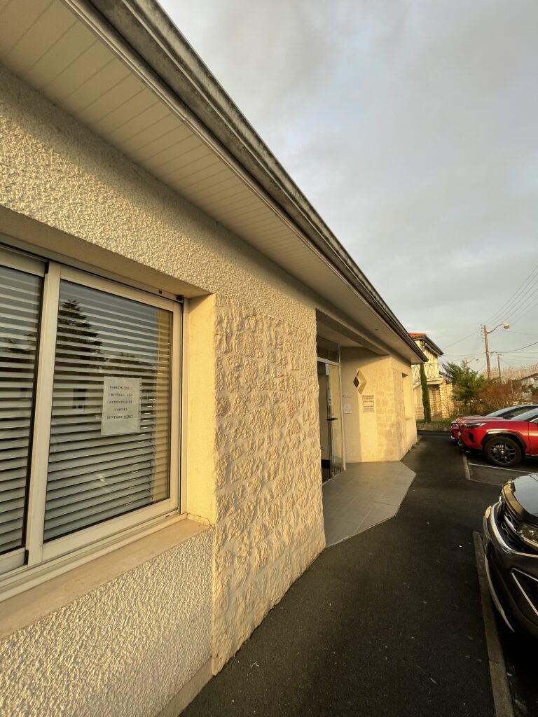 Le cabinet, de plein pied, qui date de 2002, fait 150m2 sur une surface extérieure de 1000 m2 avec 7 places voitures dont une pour personne handicapée. Il est aux normes PMR. Il est bien situé (arrêt de bus, gares…).